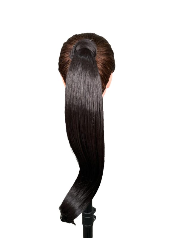 Postizo de cabello sintetico, manejable al calor, fácil colocación con velcro y peineta, largo aproximado de 46 cm.