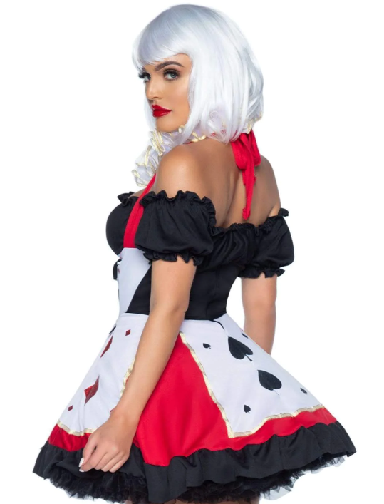 Haz un viaje por la madriguera del conejo en 2 PC. Disfraz de Halloween para mujer Pretty Playing Card de Leg Avenue. Este disfraz sexy del país de las maravillas incluye un vestido estilo campesino con cintura de corsé y cuello con volantes.