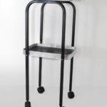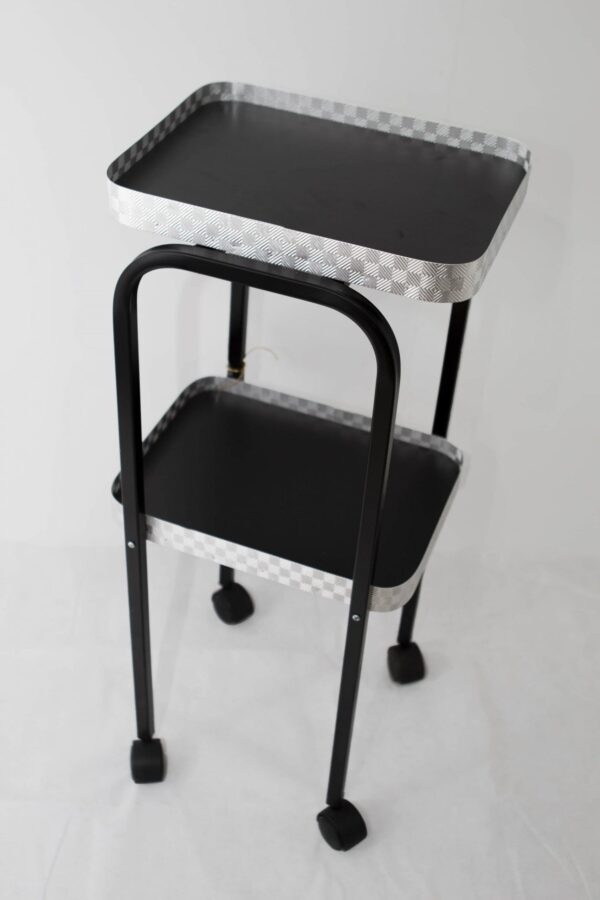 Auxiliar movible integrado con dos charolas de madera aglomerada con contorno de aluminio y estructura de metal. Dimensiones de 90cm x 38cm x 30cm