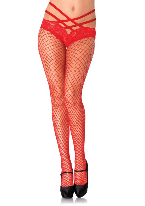 Pantimedias Rojas de Red punto grueso con encaje en forma de pantaleta, diseño de tiras entrecruzadas en color rojo que te harán ver mas sexy.