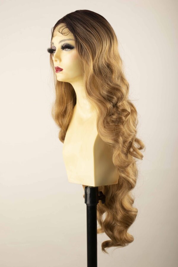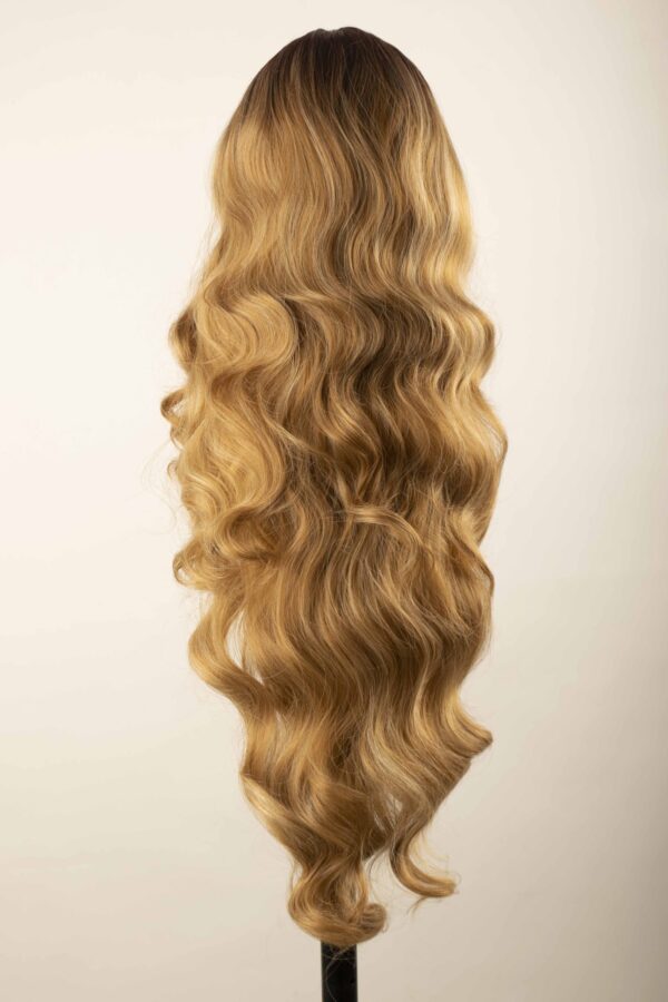 Peluca Icy de cabello sintético con lace front de cabello largo aproximado de 85 cm desde la raíz hasta la punta.