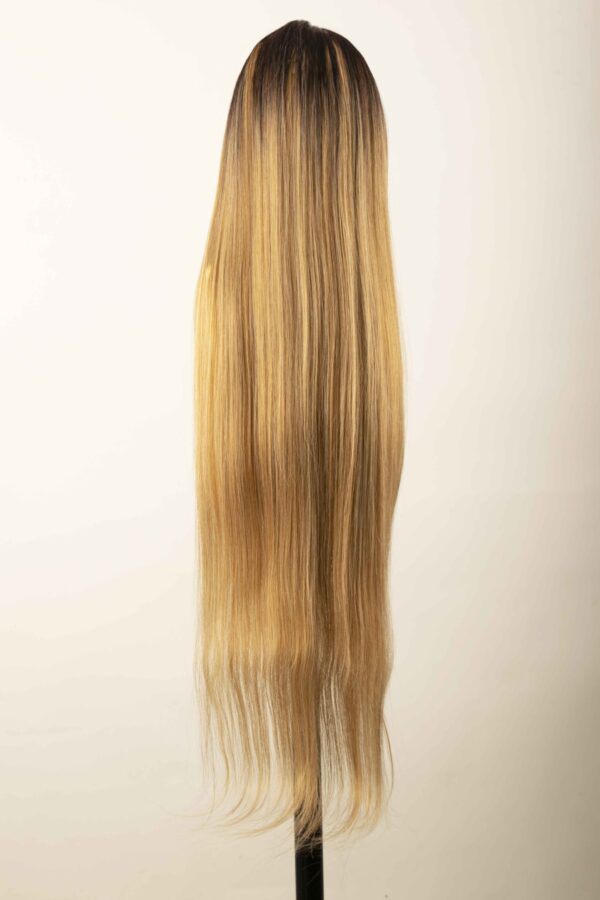 Peluca Paki de cabello sintético con lace front de cabello largo aproximado de88 cm desde la raíz hasta la punta.