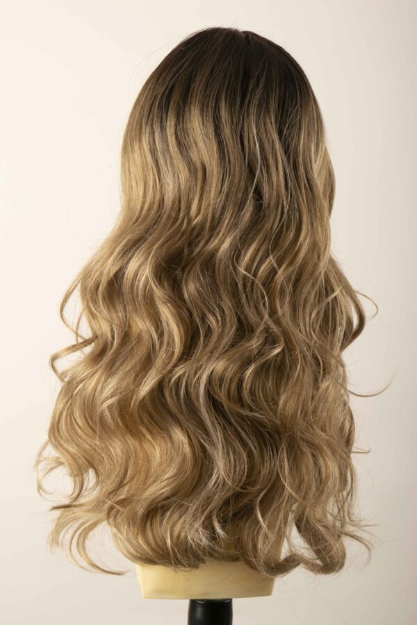 Peluca Samie con lace front de cabello largo aproximado de 70 cm desde la raíz hasta la punta.